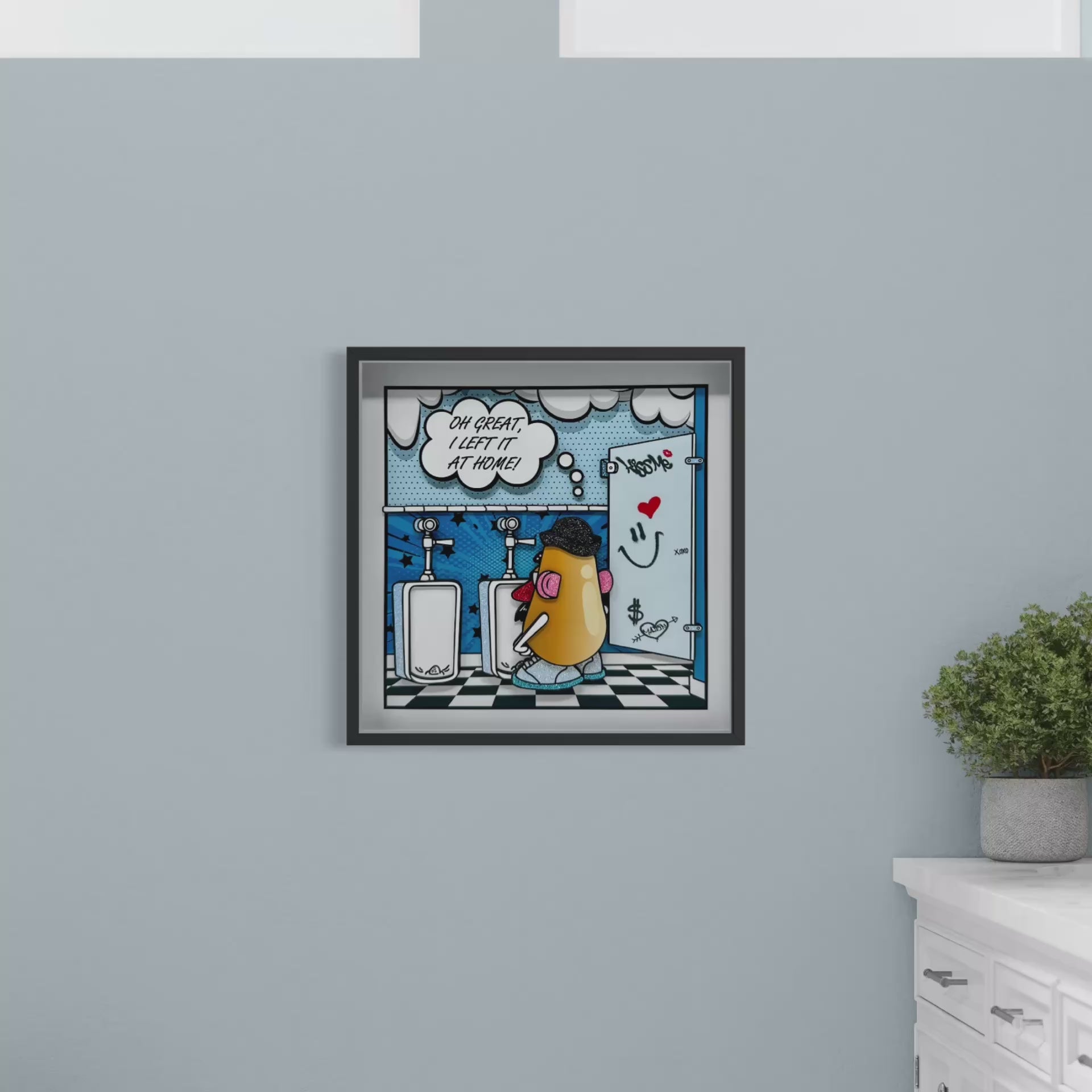 The graffiti heart on the bathroom stall can be personalized with initials, a name, or a short word of your choice. If you prefer not to customize it, the heart will read “MAZIN”.